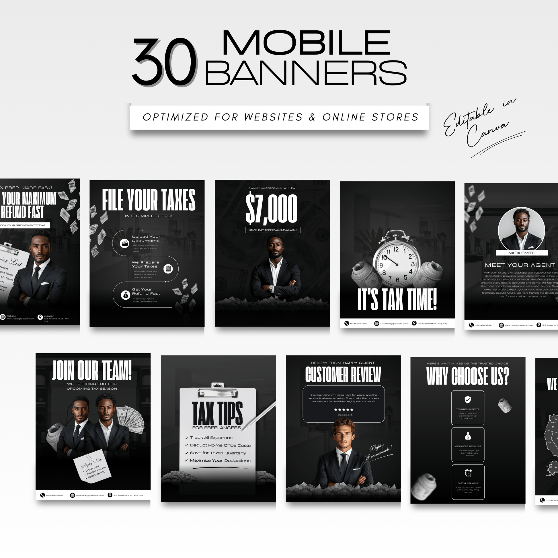 - π± 30 Noir Mobile Banners: Perfectly sized to ensure your luxury brand looks flawless on every smartphone.