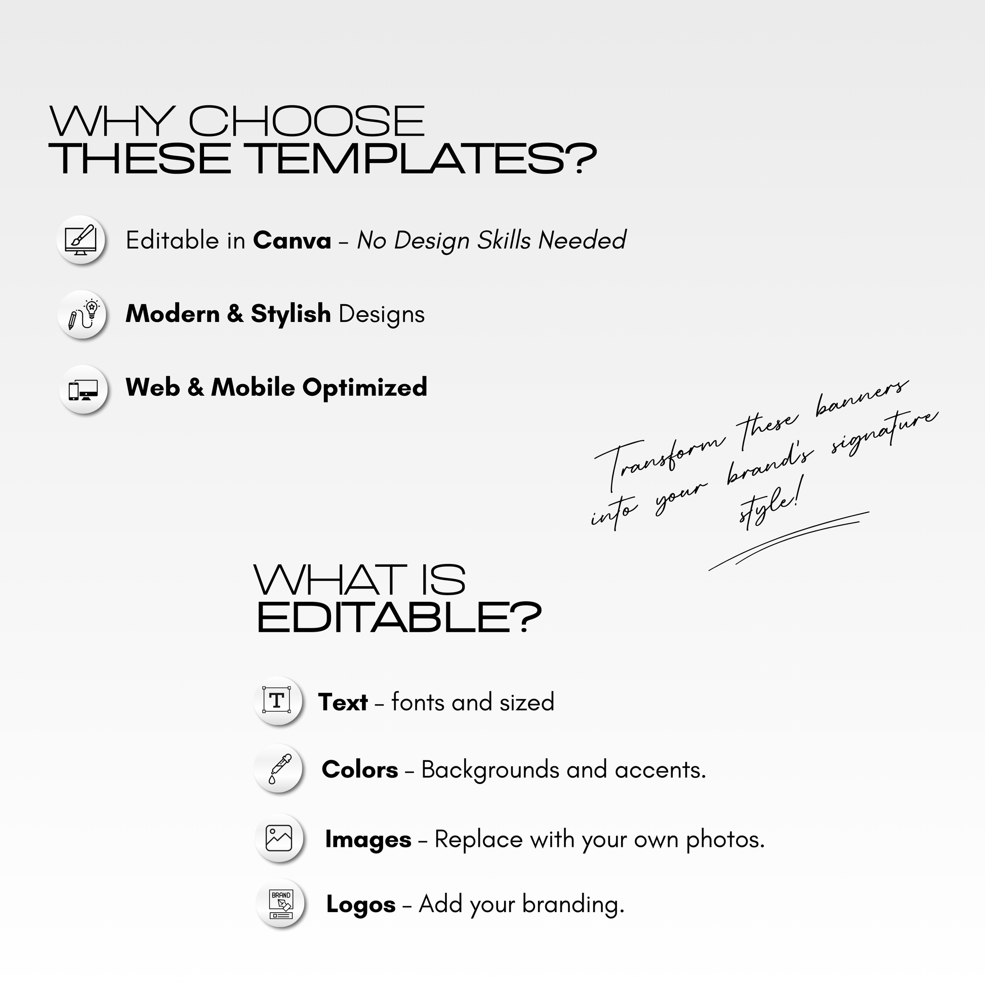 Transform these templates to reflect your brandβs elite status in minutes. Easily customize colors, images, and fonts with a free or Pro Canva account.