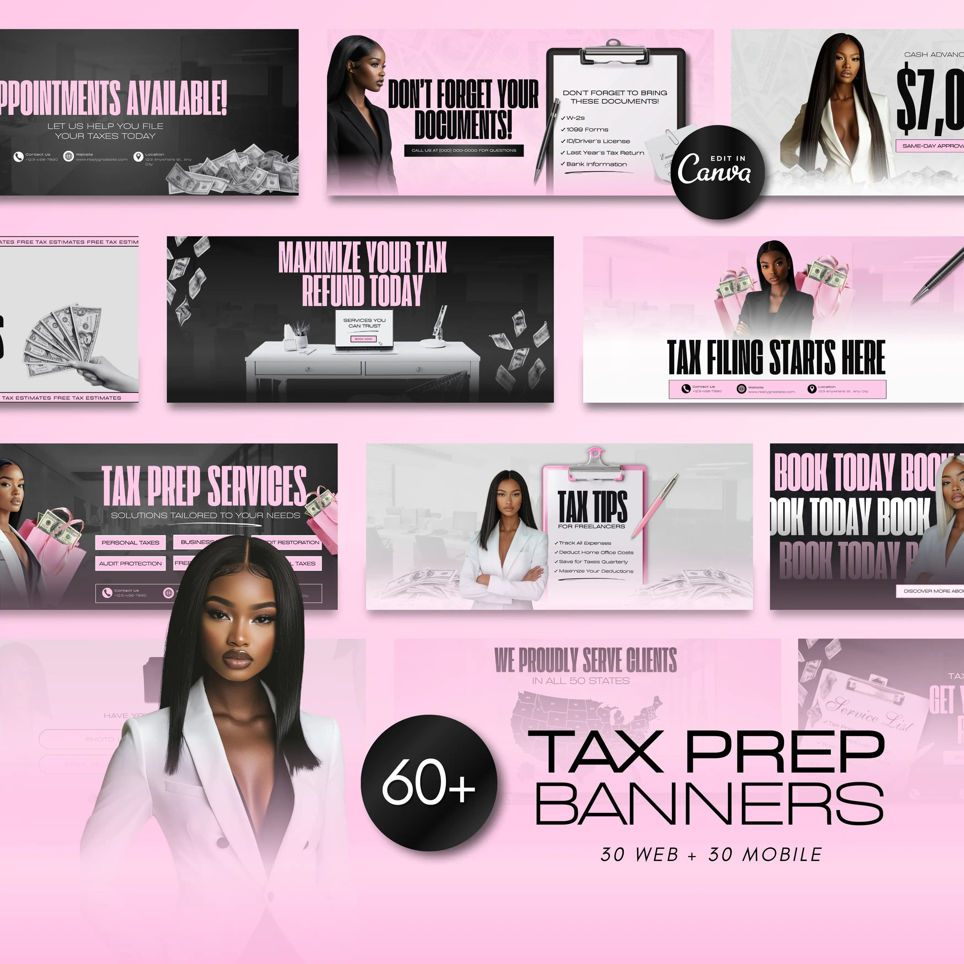Transform your online presence with our 60 Pink Glam Tax Prep Banners. This bundle is the ultimate solution for modern, stylish, and professional branding for tax pros who want to make a bold statement. Whether you're running a website on Shopify or Wix, or promoting via social media, these banners are designed to make your brand stand out effortlessly.