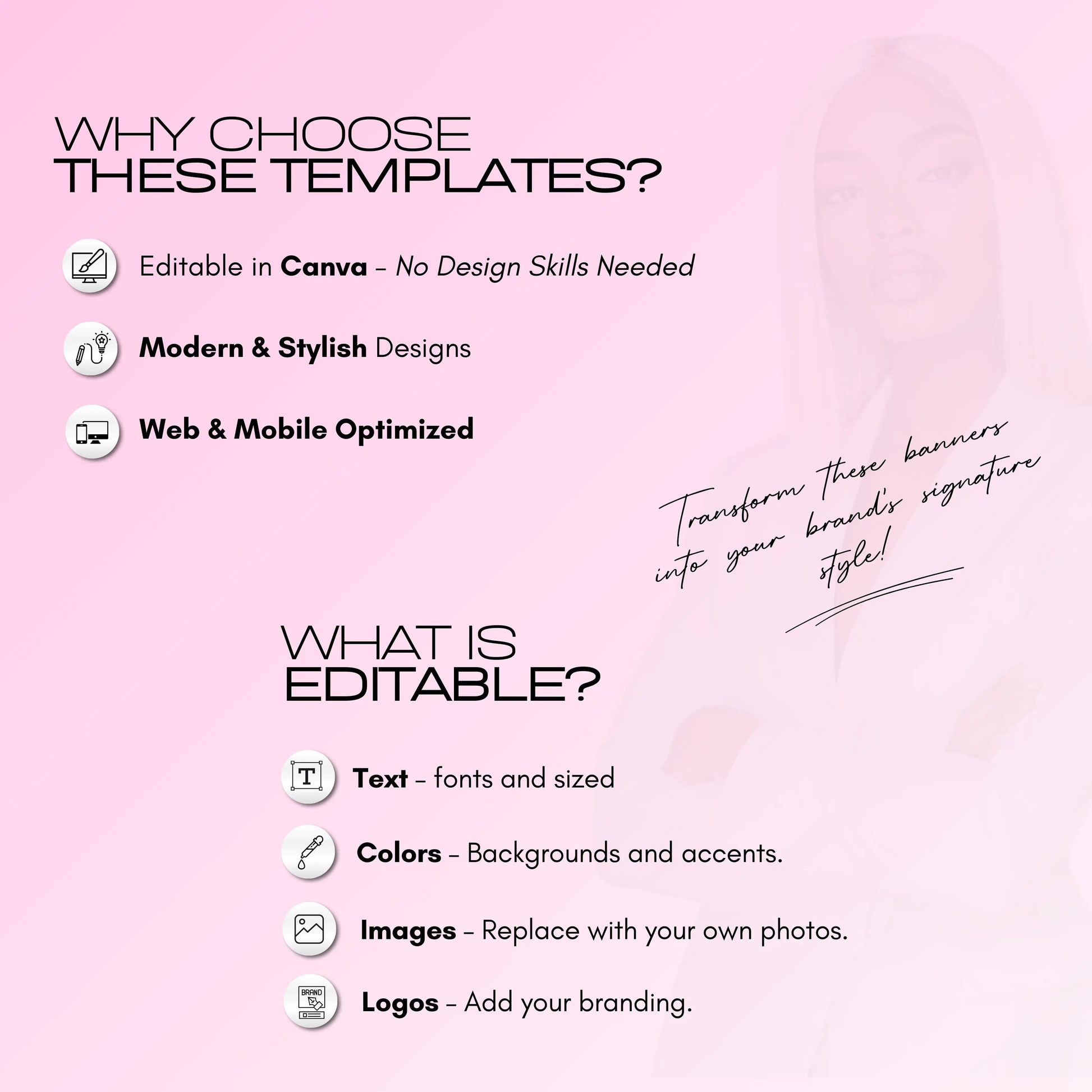 No graphic design or technical skills are required! Transform these time-saving templates to reflect your brandβs unique ethos in minutes. Easily customize: