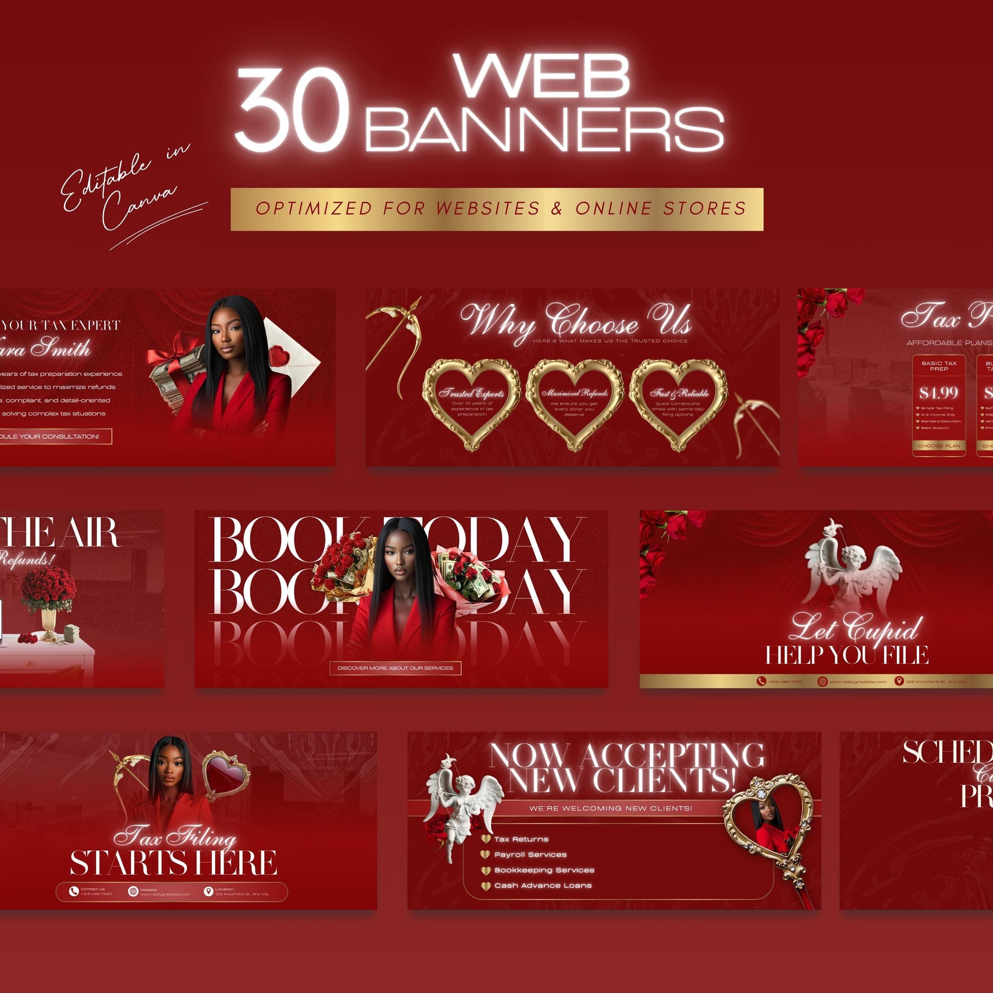Transform your online presence this season with our 60 Valentine Tax Prep Banners. Designed with a stunning deep red and luxury gold aesthetic, this bundle is the ultimate solution for modern, stylish, and professional branding. Whether you're running a website on Shopify or Wix, these banners are designed to make your brand stand out effortlessly during the busiest time of the year.