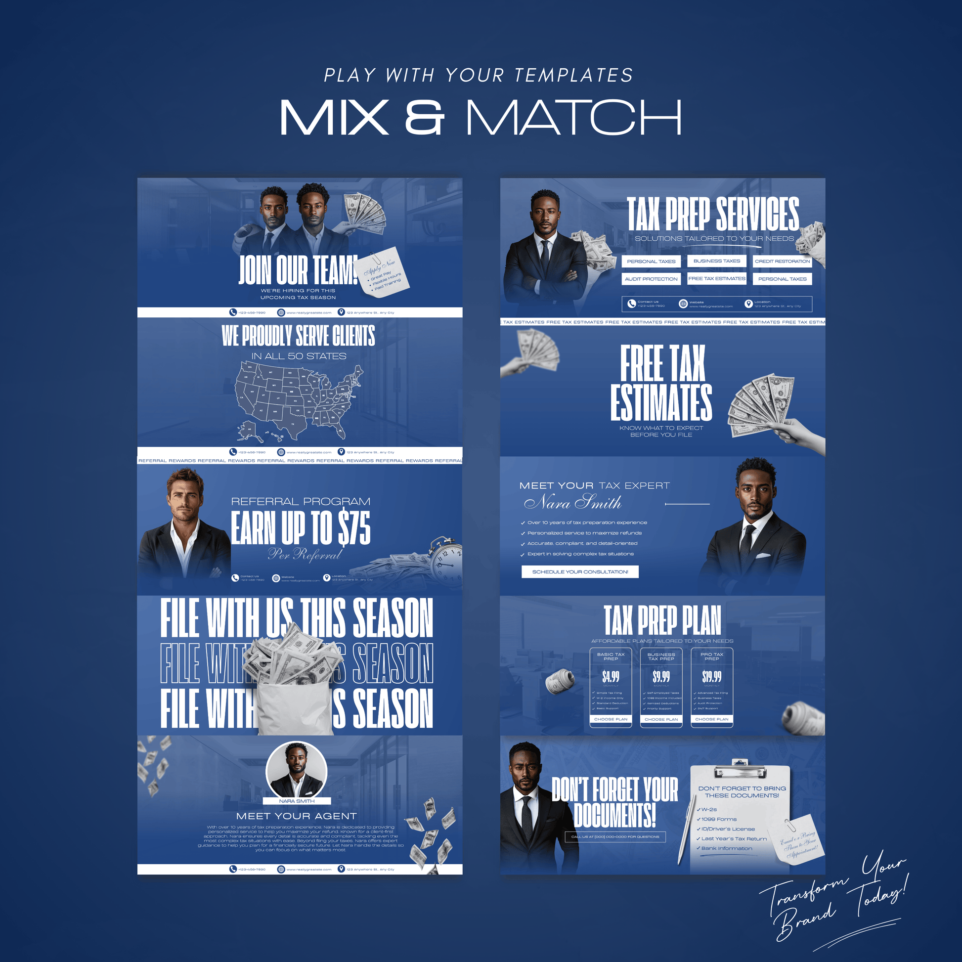 - π Multi-Purpose Marketing Layouts: Includes designs for Tax Tips, Document Reminders, "Meet Your Agent," and Seasonal Filing Promotions.