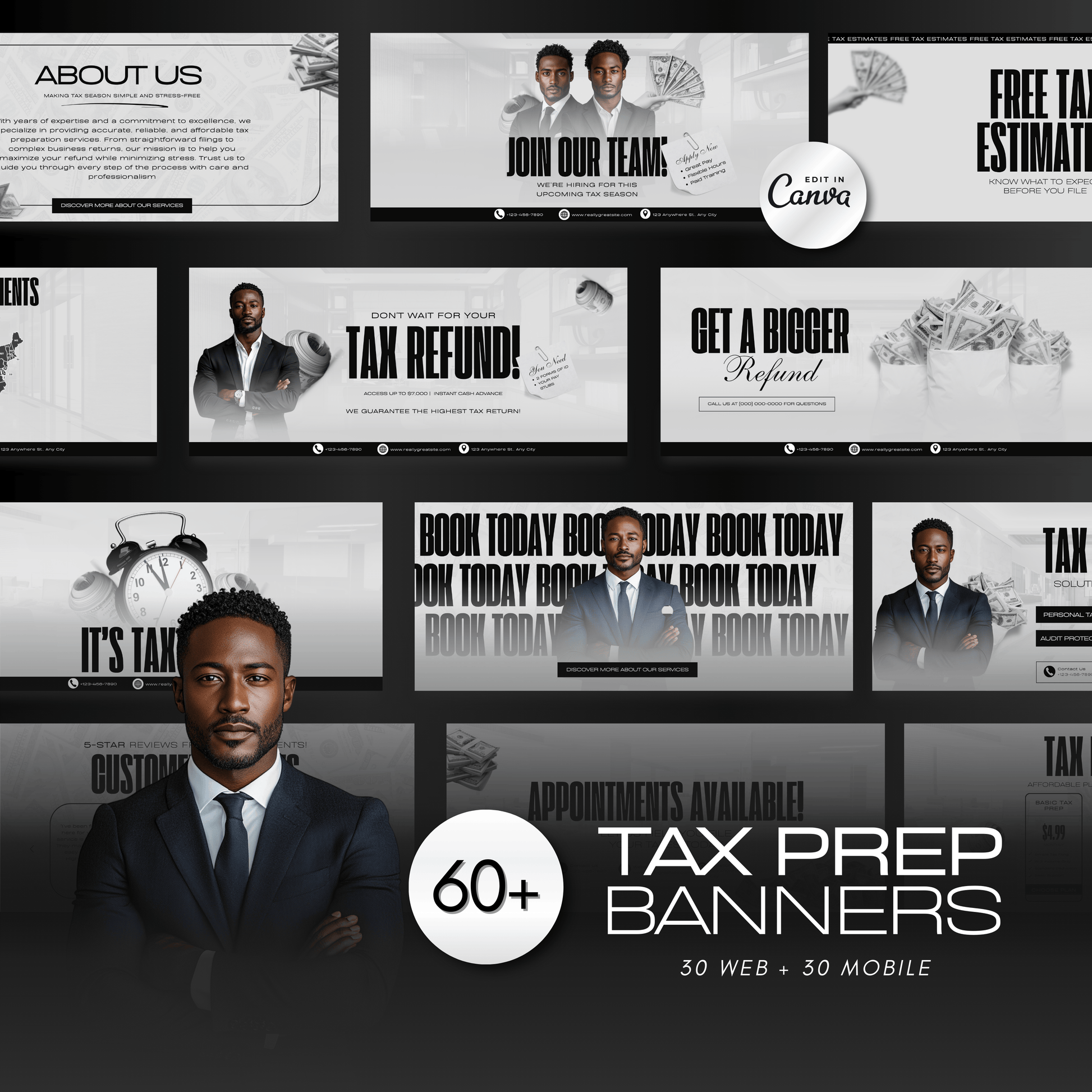 60 Professional Black and White Tax Prep Banners Canva Templates | Modern Accountant Web Banners
