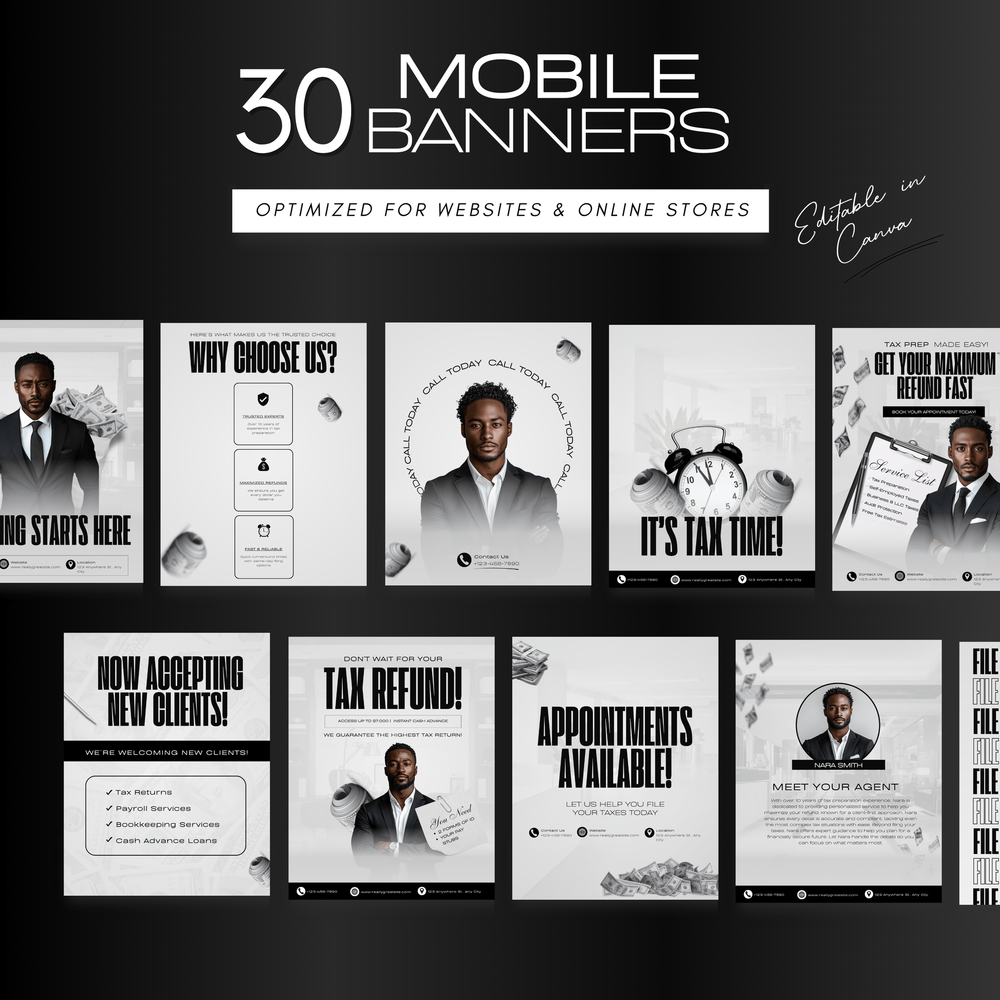 - 📱 30 Mobile-Optimized Banners: Ensure your branding remains flawless for clients browsing on their smartphones.