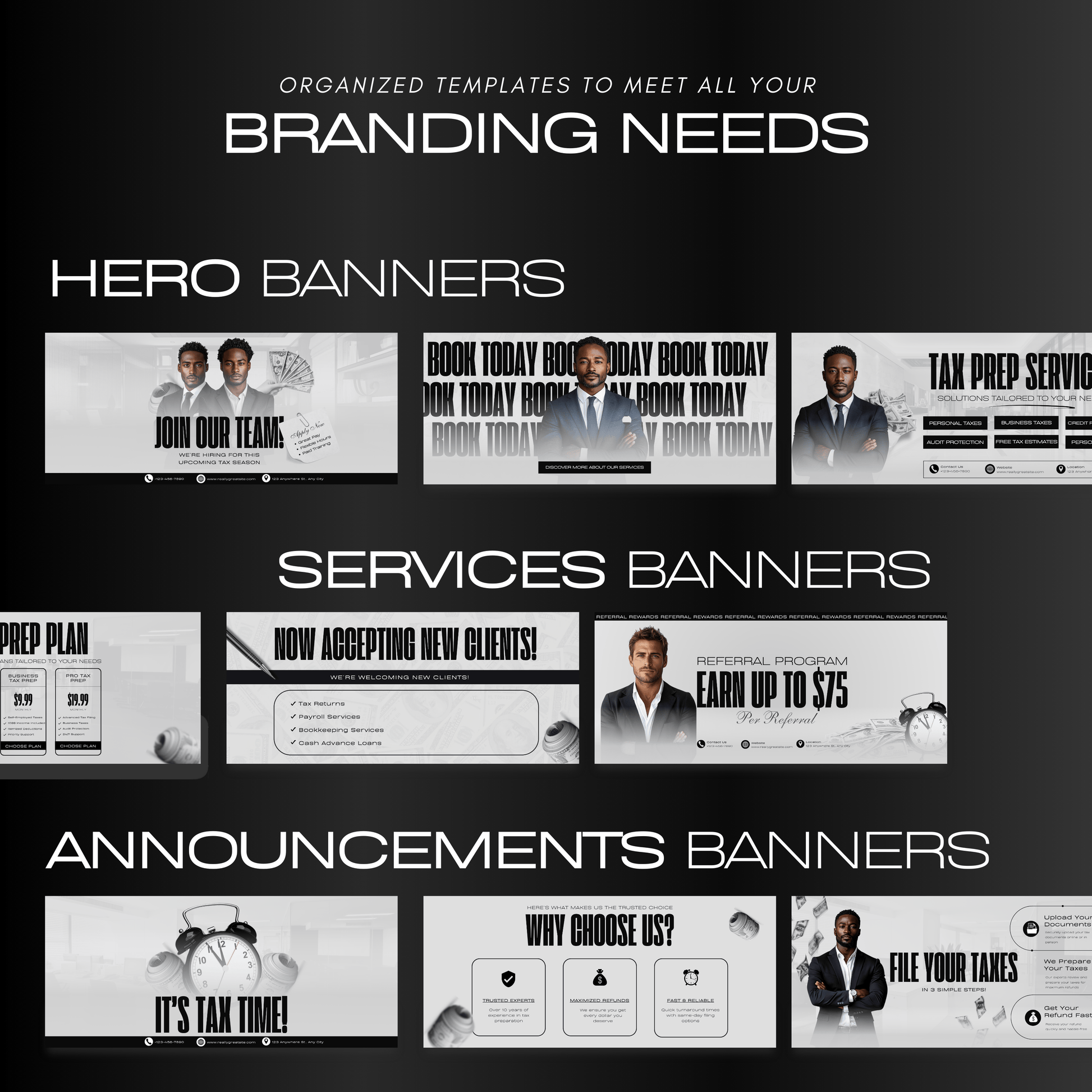 💼 Executive Minimalist Branding: 60 Professional Black and White Tax Prep Banners