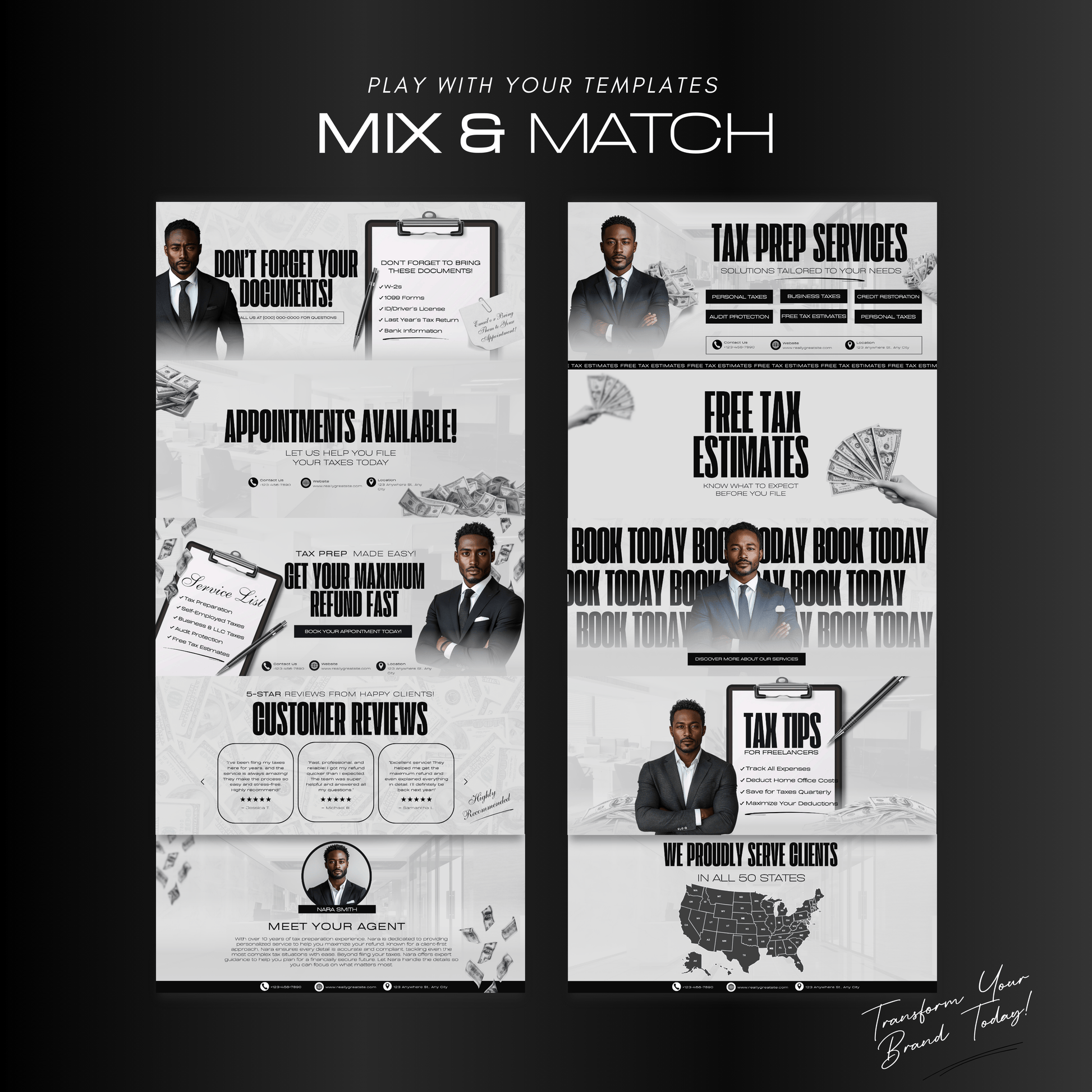- 📁 Strategic Content Layouts: Specific designs for "Meet Your Agent," Tax Filing Promotions, Document Reminders, and Seasonal Tips.